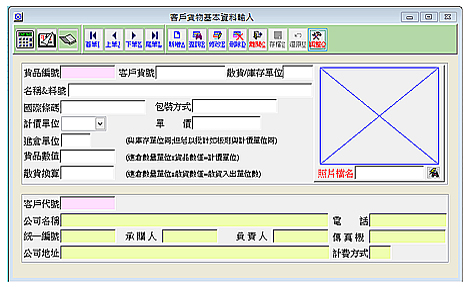 【貨品資料管理系統】 建立客戶貨品相關基本資料。可設定客戶貨號及國際條碼資料,計價單位可用才或坪或KG等計價,亦可 建立進倉單位或散貨單位,大大提高系統靈活度。 再可建立貨品數值目的為自動計算計價單位=進倉數量單位x貨品數值。 建立貨品照片資料,照片格式可為JPG或BMP或TIF等一般通用格式,點照片兩下可放大照片,客戶貨品建立完整無誤。