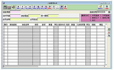 【進倉單管理系統】 進倉單號可設定為流水號或自行輸入,進倉方式可採40呎進貨或20呎進貨或散裝以才或散裝以噸等方式,進倉貨品可自行輸入或整批帶入客戶商品或以檔案匯入方式產生進倉單,建檔快速。 入倉裝卸費 會依客戶貨品檔,自動產生,亦可輸入櫃號及散貨數量,可多重處理倉租計算數量及散貨入庫數量。