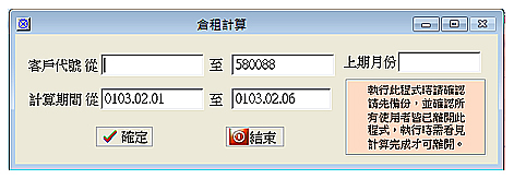 【倉租結算處理】 此功能主要為結算當期倉租,倉租計算可採多種方式如以日計、5日計、10日計、進以5日出以旬、租坪及進以日出以旬計算。包含統計計算期間內之倉租收入 ( 倉租收入=期初庫存+入倉-出倉 ) 及入倉單之裝卸費及統計期間內之其它費用。 倉租結算完成核對無誤後,可執行帳款月結處理,可將本月帳款確認 歸檔,做為本月應收帳款依據。